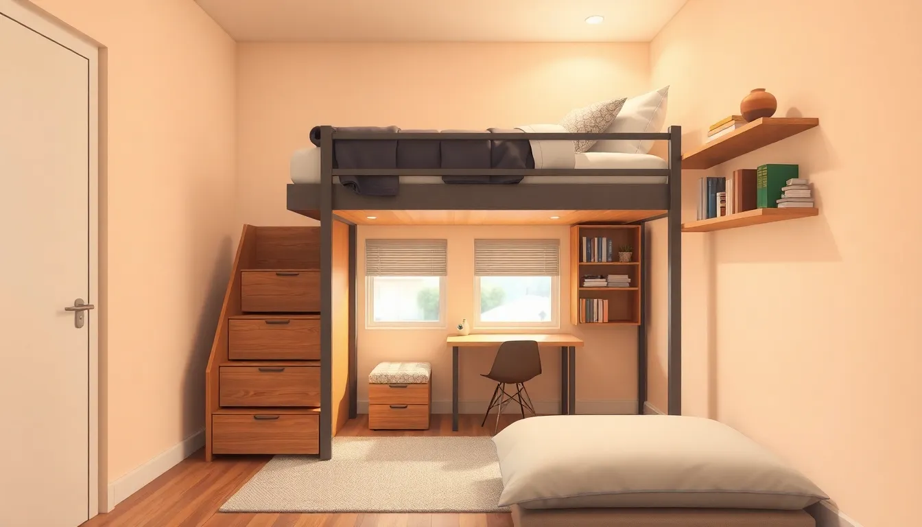 Consider using a bed with built-in storage. Options include drawers or a lofted bed design, making room for a desk or seating underneath. Wall-mounted shelves offer additional storage without taking up floor space. Folding furniture, such as chairs or tables, easily adjusts to available space when guests visit. Lastly, modular units provide flexibility, allowing for reconfiguration based on changing needs.